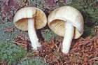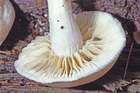 Makroskopische Bestimmungsmerkmale: Hut 3 bis 5 cm breit, jung breit konvex mit stark eingebogenem oder eingerolltem, stets nach unten gerichtetem Rand und schwachem, undeutlichem Buckel, dann breit gewölbt bis halbkugelig, nicht vertieft, nicht hygrophan, creme-weißlich mit schmutzig blass leder- graubräunlichen Tönen, feucht schwach klebrig und etwas dunkler, bald trocken und schwach glänzend oder schwach radialfaserig, oft fleckig oder radial streifig und alt vom Rand her auch schwach cremeocker verfärbend, ziemlich fest mit dickfleischigem Kern. Lamellen jung mitunter weiß, meist aber von Anfang an blass ockergelb gefärbt, später besonders um den Stiel auffallend lebhaft creme- bis ockergelb, schmal und tief ausgebuchtet, etwas dicklich, ziemlich breit, wenig bauchig, ziemlich dichtstehend, am Hutrand mit bis 11 Lamellen pro cm, sehr breit, bis 9 mm breit bei 18 mm Länge, alt oft wellig verbogen, Schneide scharf, etwas uneben, fein hell flockig gezähnelt, aber nicht gesägt, mitunter grob ausgefressen. Stiel 3-4,5 cm lang und an der Spitze 5-10, am Grund 5-9 mm dick, zylindrisch, oft etwas verbogen, gelegentlich auch exzentrisch, sehr fest und fleischig, an der Spitze von den Lamellen schwach weißlich gerieft und weißmehlig, abwärts spärlich längsseidig-faserig, ohne erkennbare Cortinareste, gegen den Grund auch etwas längsrillig gefurcht, etwas zuspitzend, gelegentlich auch abgestutzt und dem Holz aufgepfropft, mitunter ziemlich weit hinauf mit weißem Myzelfilz. Fleisch weißlich, ziemlich fest, etwas durchwässert, teils mit starkem Geruch ähnlich Jodoform, teils mit mehr rettich- bis obstartigem, angenehmem Geruch und sehr bitterem Geschmack.
